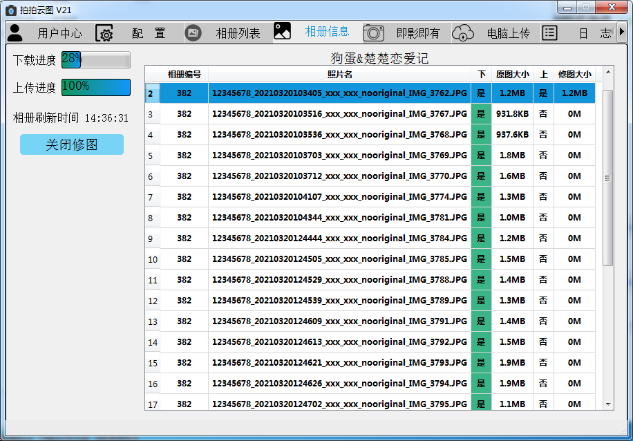 管理员相册是在用户端相册页面的基础上增加了照片管理功能,管理员可以对相册中的照片设置可见或隐藏。